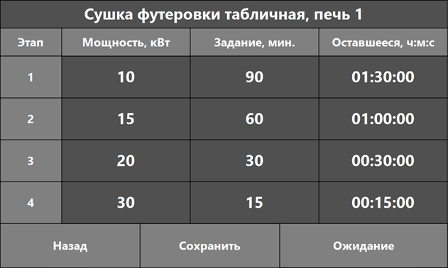 Заказчик в соответствии с применяемым футеровочным материалом и требованием к нему по спеканию может вносить изменения в таблицу в части задания мощности и времени работы при определенных заданных параметрах. Второй автоматический режим может быть произведен с применением термопары, где контроль и корректировка повышения мощности зависит от измененной фактической температуры футеровки в режиме реального времени.